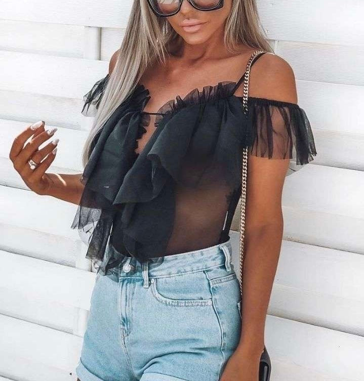 Tops tamanho único, forrados no peito e transparência na zona abaixo do peito